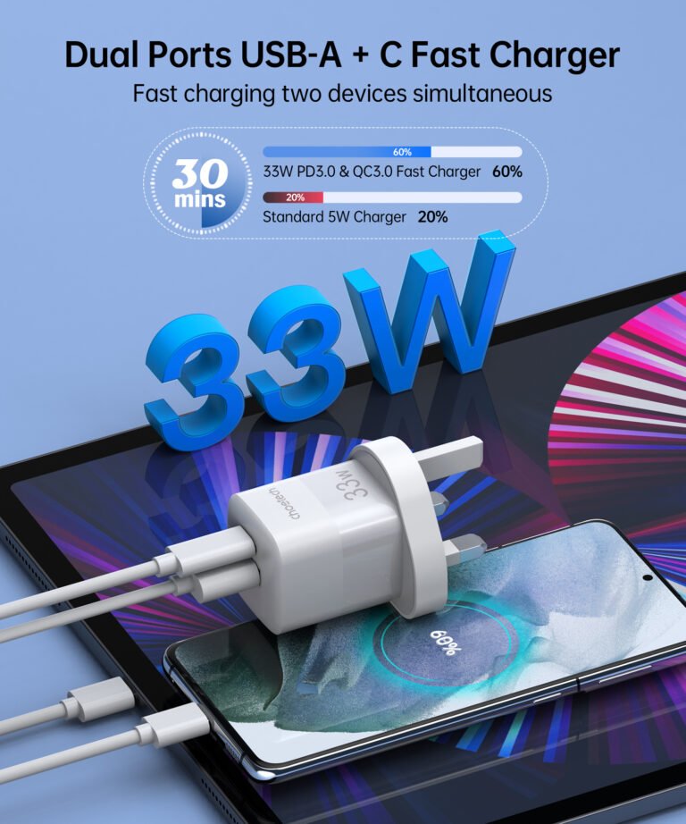 Choetech – 33W Dual Port Wall Charger – USB-C & USB-A PD Adapter