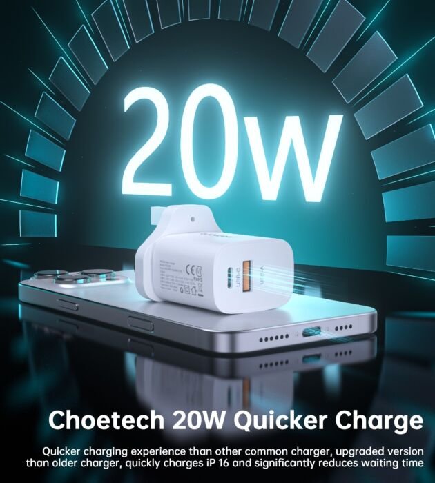 Choetech 20W USB-A and USB-C White Wall Charger w/ 1m USB-C Cable and UK Plug