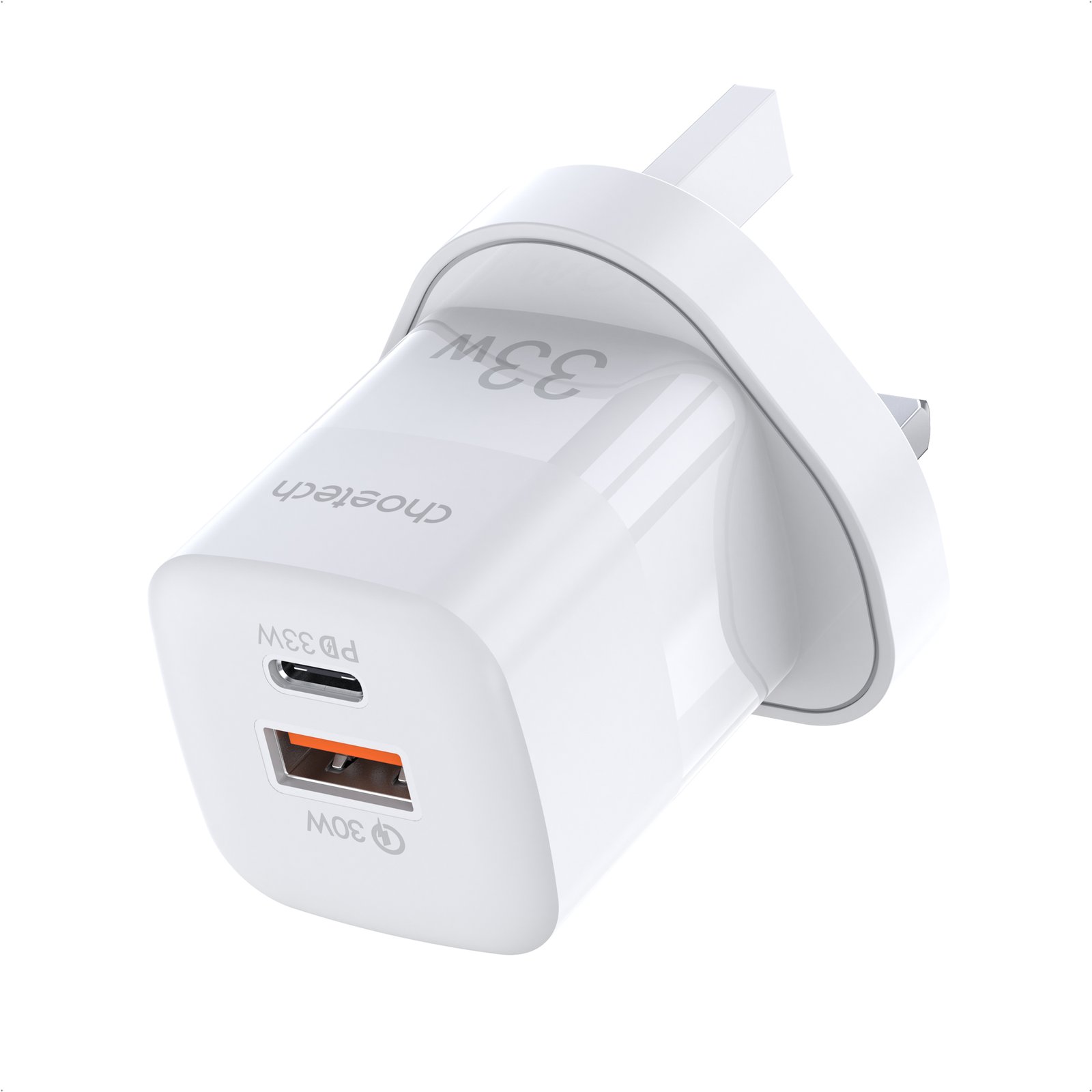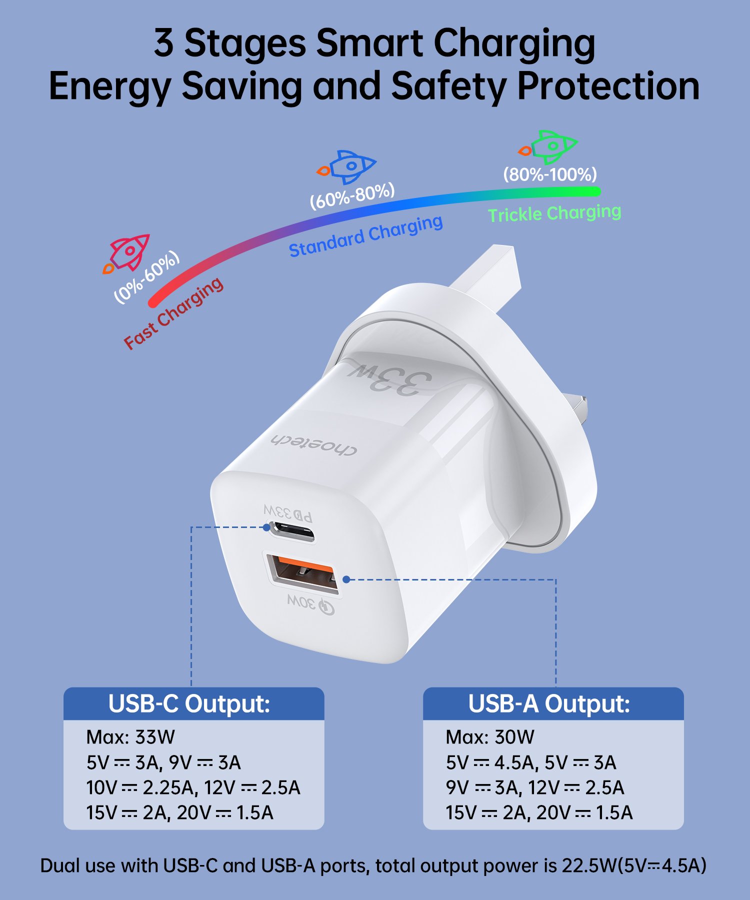 With a total output of up to 33W, this dual USB-A and USB-C wall charger will intelligently identify your devices and provide the fastest and most efficient output current – 33W for the USB-C port, 30W for the USB-A port.