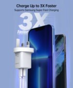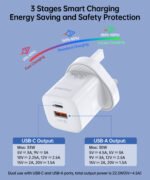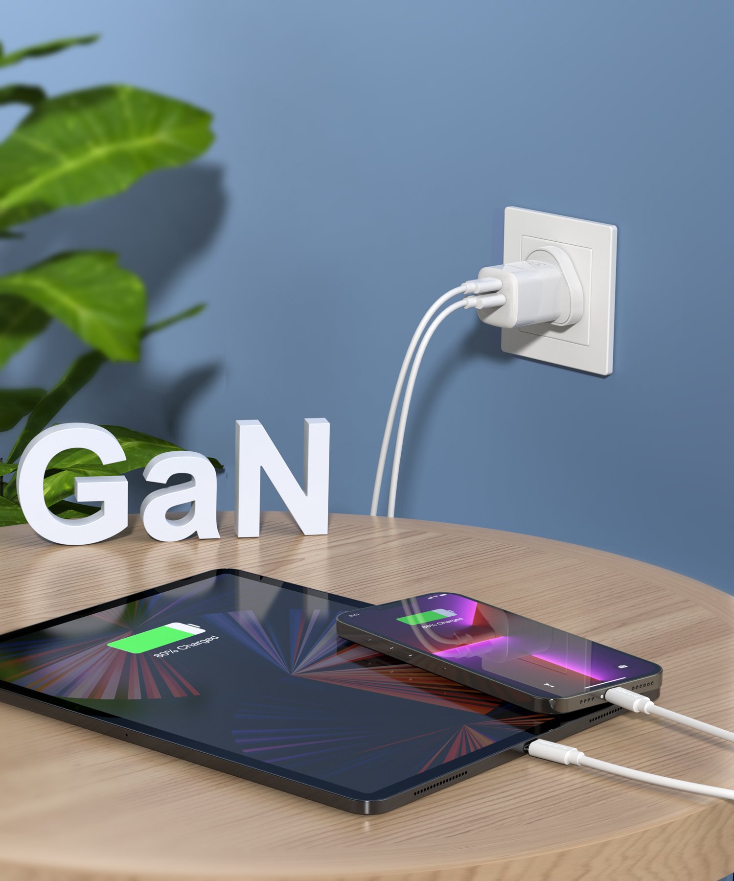 This charger with two PD 3.0 & QC 3.0 power delivery ports can simaltaneously fast charge which will save you time and save outlet place when have to charge two devices. If you use both the USB-C and the USB-A port then the total output power will amount to 22.5W.
