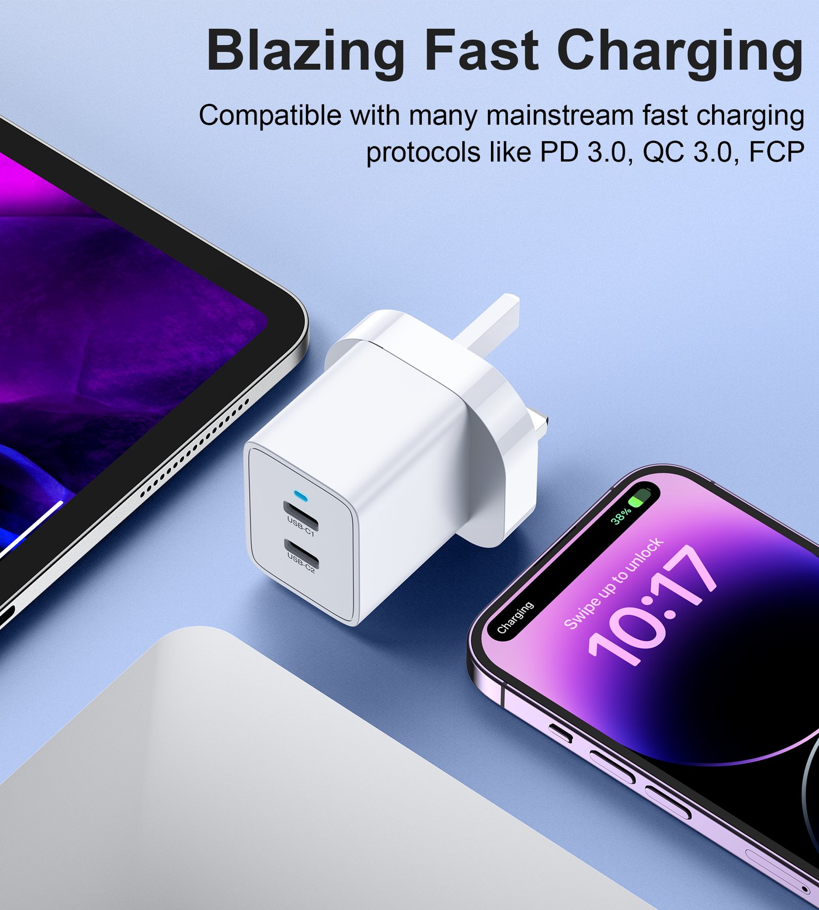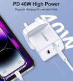 Fast Charge Two iPhone/iPads Together: Choetech’s 40W Wall Charger supports 20W PD fast charging protocol which means you can fast charge an iPhone and an iPad to 50% in 30 minutes at the same time. You can fast charge any two Type-C PD-compatible devices simultaneously.