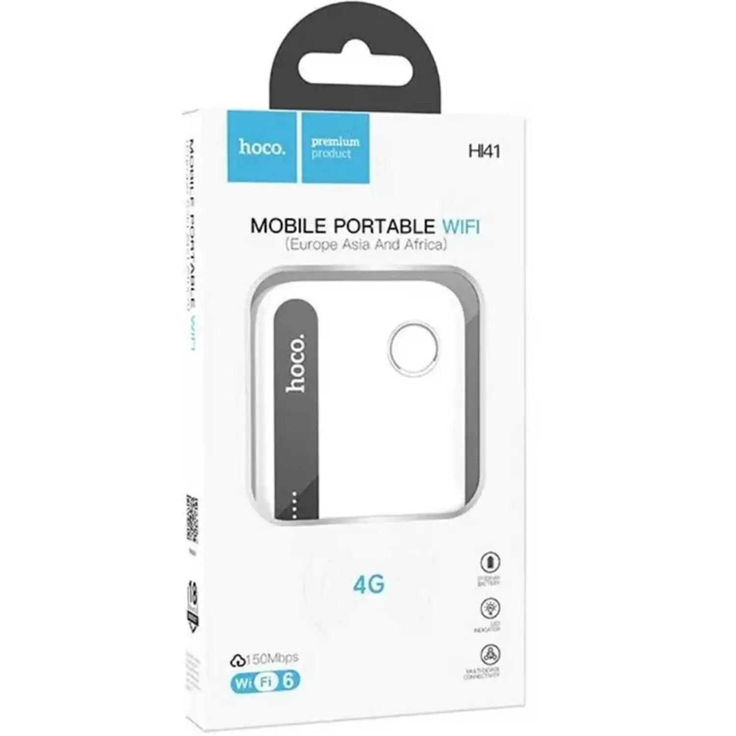 The Hoco HI41 4G Mobile Portable WiFi Hotspot provides fast internet connectivity with download speeds up to 150 Mbps and upload speeds of up to 50 Mbps. It operates on the 2.4GHz frequency with WiFi 6 support, offering efficient and stable connections. The device is powered by a 2100mAh rechargeable battery, allowing for extended use while on the go. It supports up to 10 devices connecting simultaneously, making it ideal for group use or small teams. The Hoco HI41 is compatible with micro SIM cards, providing flexibility in choosing your network provider for global connectivity.